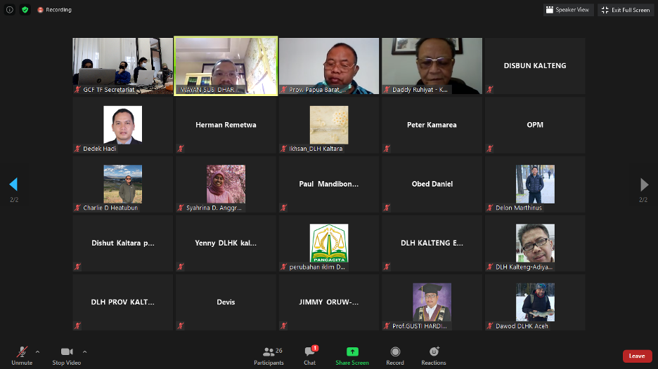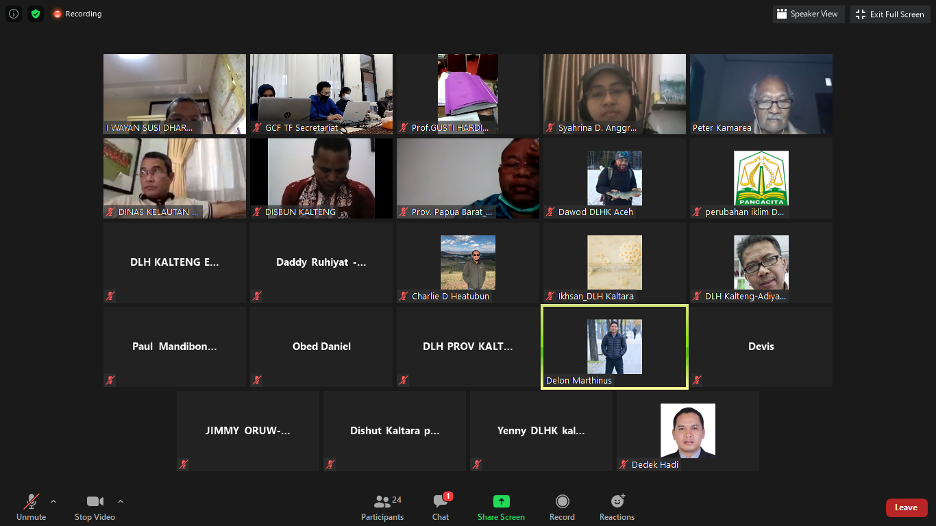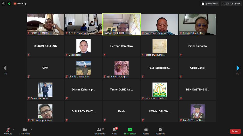 31 members attended the webinar, including: the Delegation of East Kalimantan, Environment and Forestry Agency of Aceh, Delegation of Papua, Regional Commission on Climate Change, Delegation of West Papua, Research and Development Agency, Development Administration Bureau of West Papua, the National Project Coordinator FCPF, Delegation of West Kalimantan, Environment and forestry Agency of West Kalimantan, Delegation of Central Kalimantan, Plantation Agency of Central Kalimantan, Environmental Agency of Central Kalimantan, Forestry Agency of North Kalimantan, Environment Agency of North Kalimantan, and GCF Task Force Indonesia Regional Coordinator.